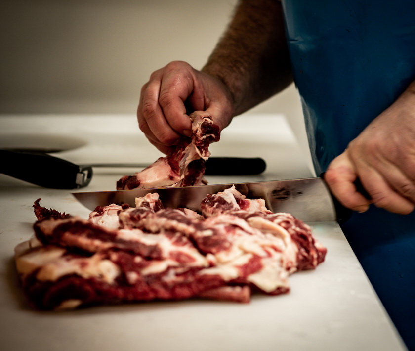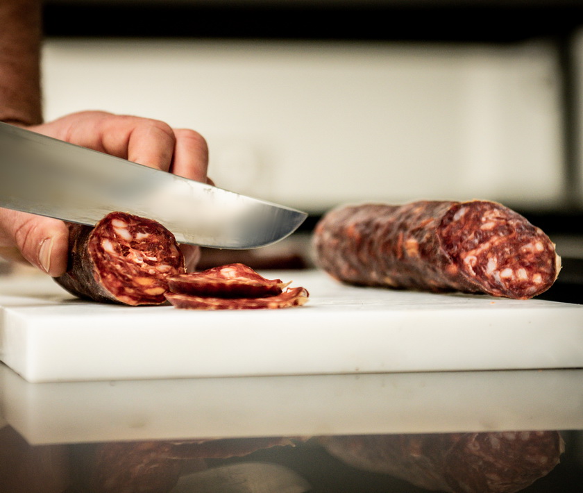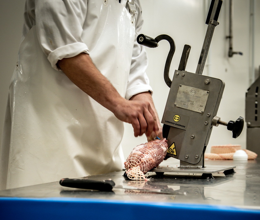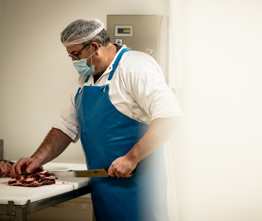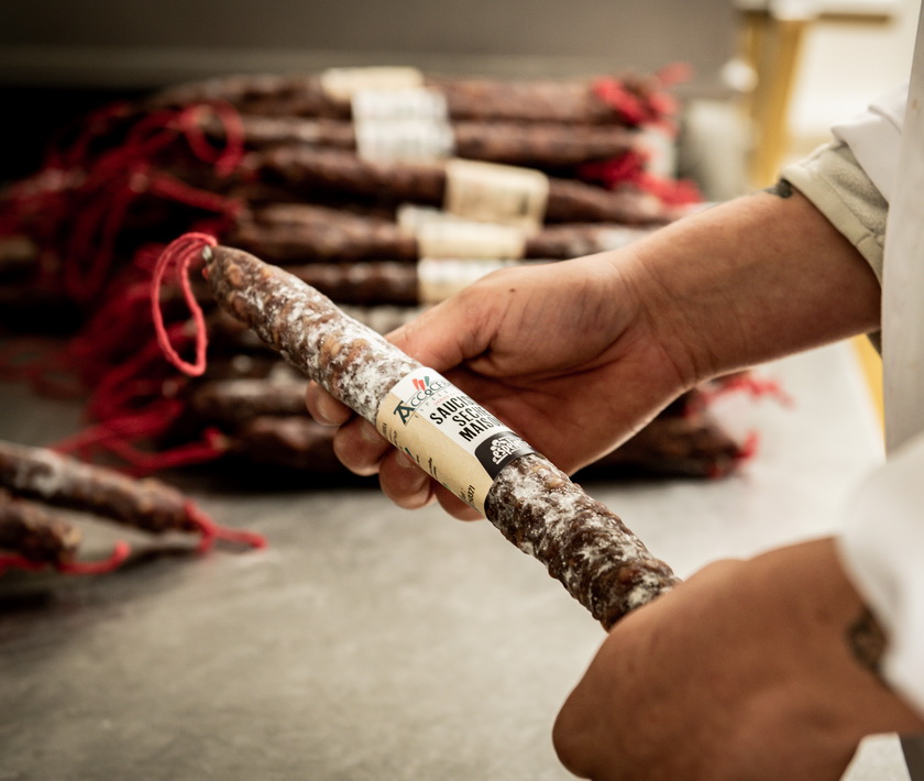 Depuis toujours, la maison est spécialiste de charcuterie et des métiers de bouche. C’est ainsi que l’on peut voir, accolé à la section dédiée aux conserves, le « coin » de Jean-Marc, le boucher de la maison depuis les années du « Père Acco ». On peut l’y voir préparer, attendrir, couper, hacher ou encore mélanger la viande mais aussi plus tendrement suspendre soigneusement ses charcuteries le long des séchoirs.